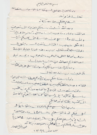 به مناسبت سالگرد شهادت دبیر کل سابق حزب الله لبنان، شهید سید عباس موسوی، کانال تلگرام پژوهشگاه تخصصی شهید صدر تصویر، متن و ترجمه یکی از نامههای شهید صدر به وی را منتشر کرد: